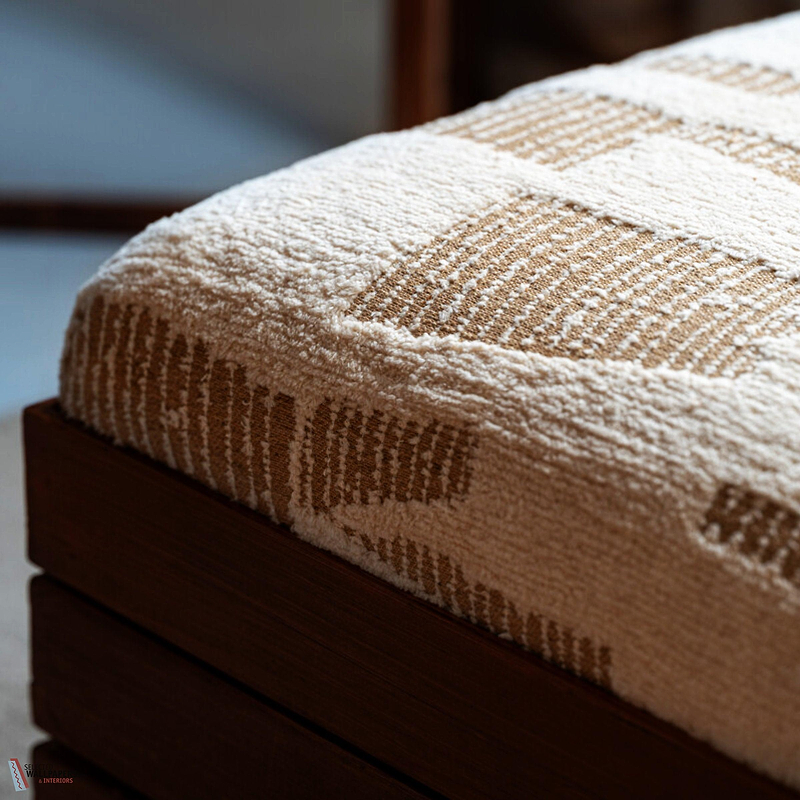Der Bardi Stoff eröffnet eine Welt der taktilen Raffinesse und visuellen Tiefe. Das Gewebe zeigt ein subtiles grafisches Muster, bei dem Zonen aus hellbeigen und sandfarbenen Flächen mit strukturierten, dunkler gewebten Partien abwechseln. Der Stoff strahlt eine natürliche Gelassenheit aus, mit einer organischen Textur, die an handgewebte Traditionen erinnert. Es ist ein Material, das Ruhe und Authentizität vereint, wobei die Nuancen in Farbe und Webung eine spielerische Spannung zwischen dem Unifarbenen und dem Dekorierten schaffen.