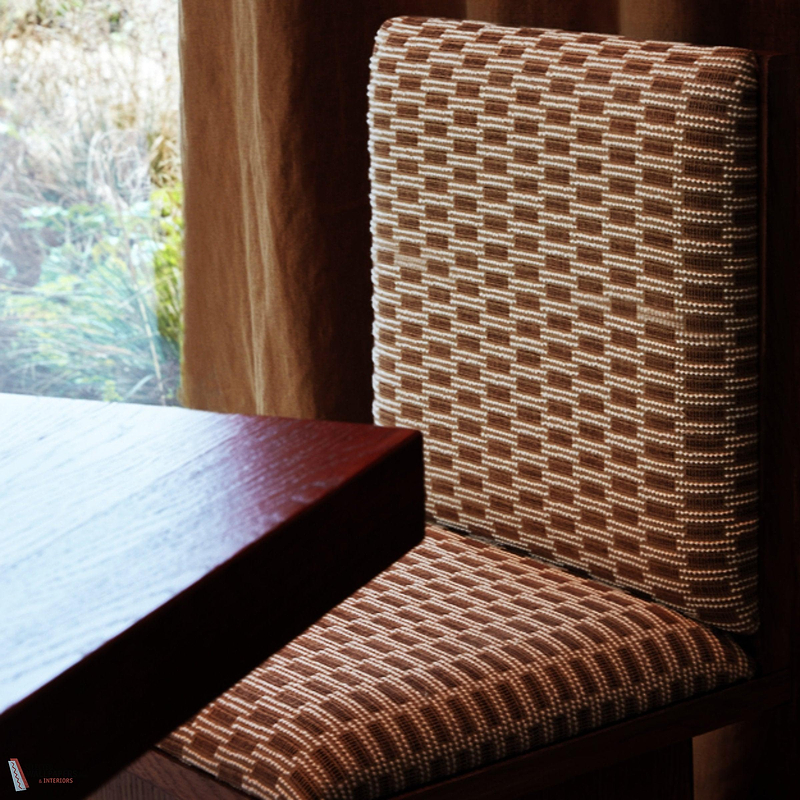 Der Endo Stoff präsentiert sich mit einem subtilen geometrischen Dessin, das an gestapelte Rechtecke in einem Brickwork-Rhythmus erinnert. Die warmen Beigetöne und der weiche cremefarbene Hintergrund kreieren ein harmonisches Zusammenspiel, das Ruhe und Raffinesse ausstrahlt. Die Textur hat einen leicht strukturierten Charakter, wodurch das Dessin nicht nur visuell, sondern auch taktil ansprechend ist. Dieser Endo Stoff bringt eine zeitgemäße Gelassenheit in Ihr Interieur, ohne aufdringlich zu werden.