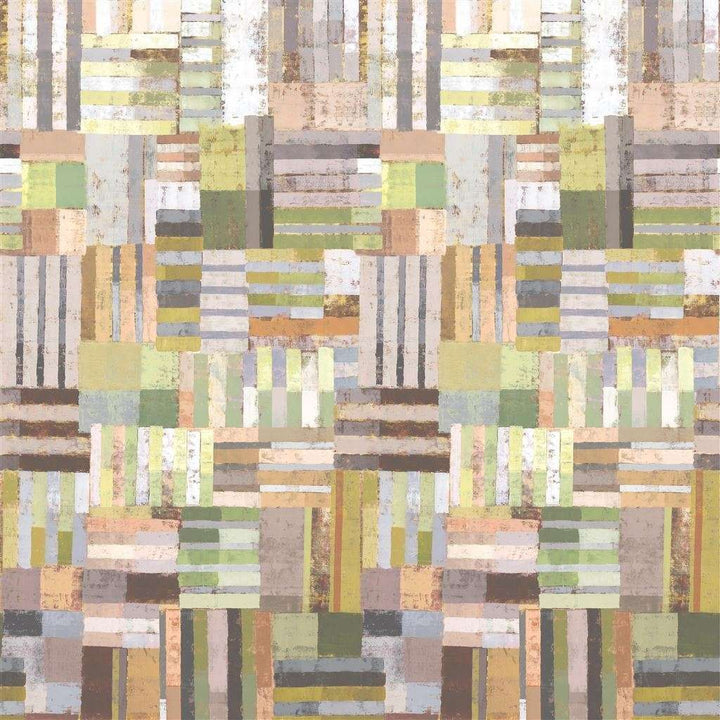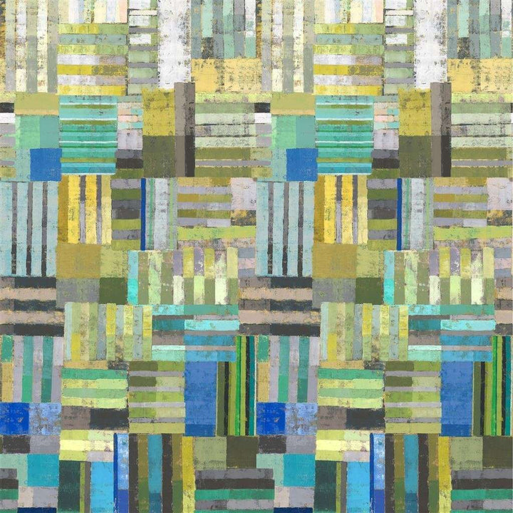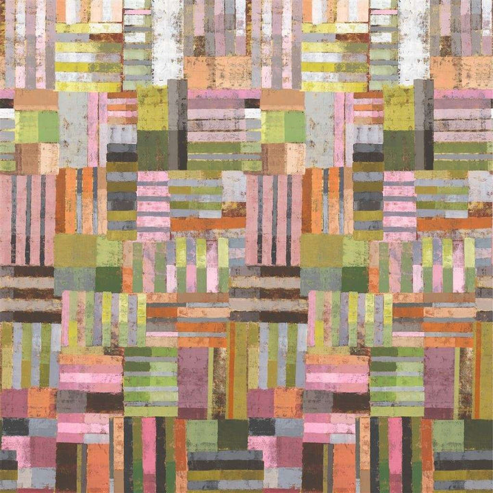 Achara Tapete von Designers Guild. Diese Tapete ist eine grafische Darstellung von strukturierten Blöcken, Quadraten und Rechtecken. Das geometrische Muster mit eingefärbten Farben ist in kräftigen Farben erhältlich.