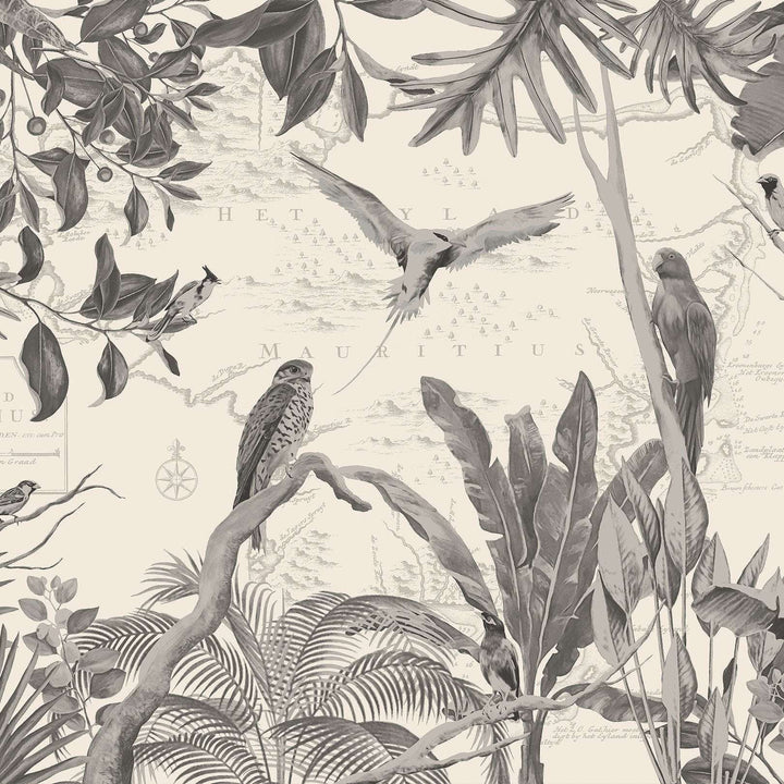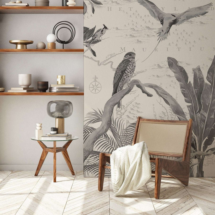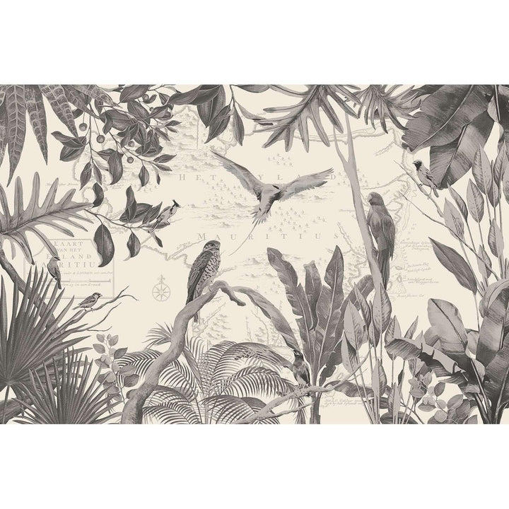 Bel Air Tapete von Les Dominotiers. Diese individuelle Tapete hat ein Panoramadekor mit einer holländischen Karte von 1753 im Tapete, im Vordergrund der Turmfalke und tropische Vögel. Ein fantastisches Wandbild!