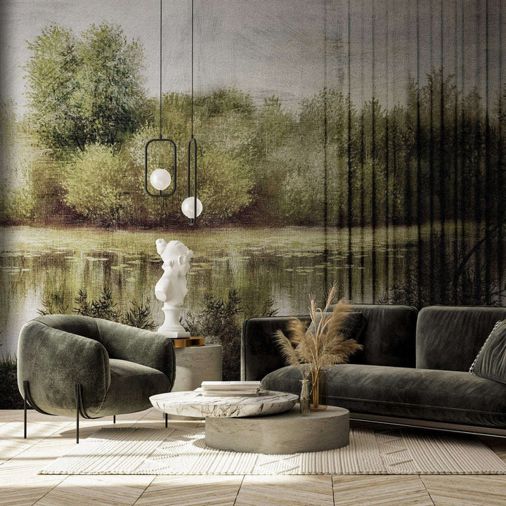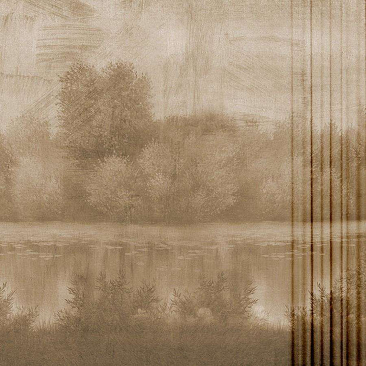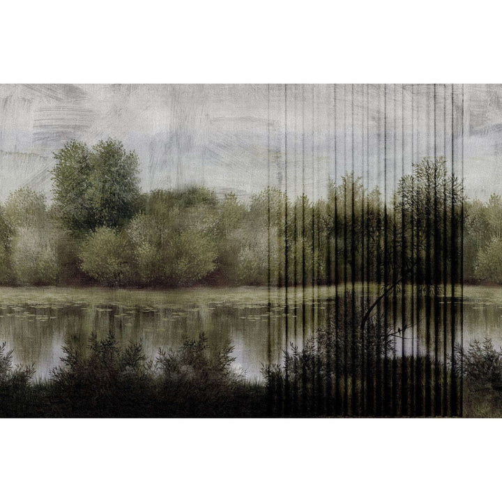 Black Pond tapete von INSTABILELAB. Diese benutzerdefinierte Tapete zeigt eine wunderschöne Landschaft entlang der Ufer des Wassers. Ein Panorama, das mit Pinselstrichen auf die Leinwand gebracht zu sein scheint.