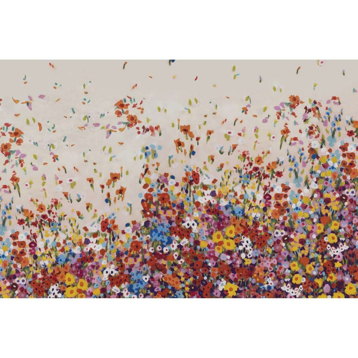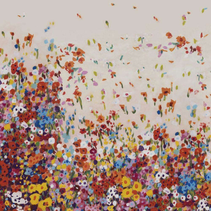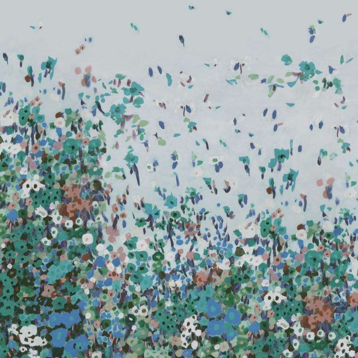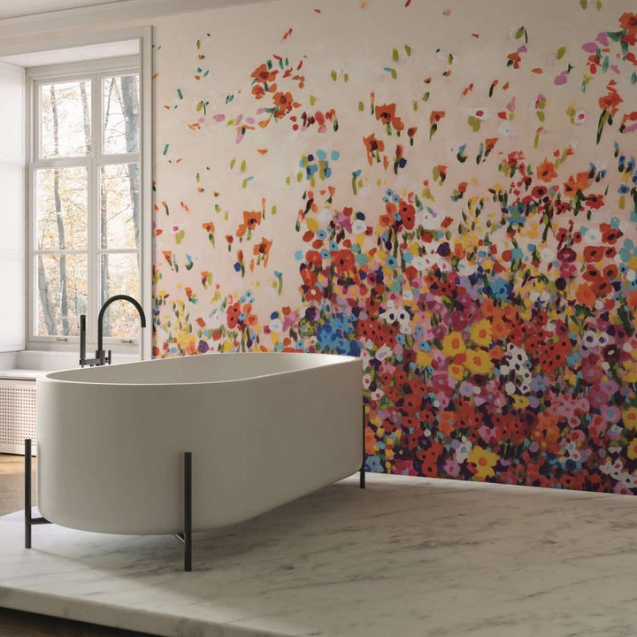 Clori Badezimmertapete von Glamora. Diese Badezimmertapete ist voller bunter Blumen. Eine farbenfrohe und natürliche Tapete. Italienische Luxustapete Custom Clori von Glamora.