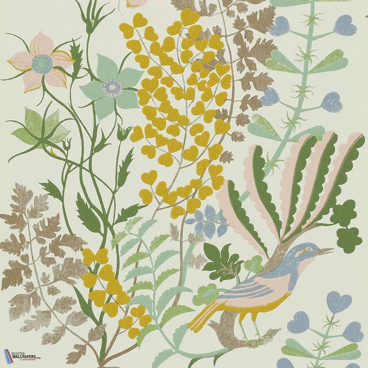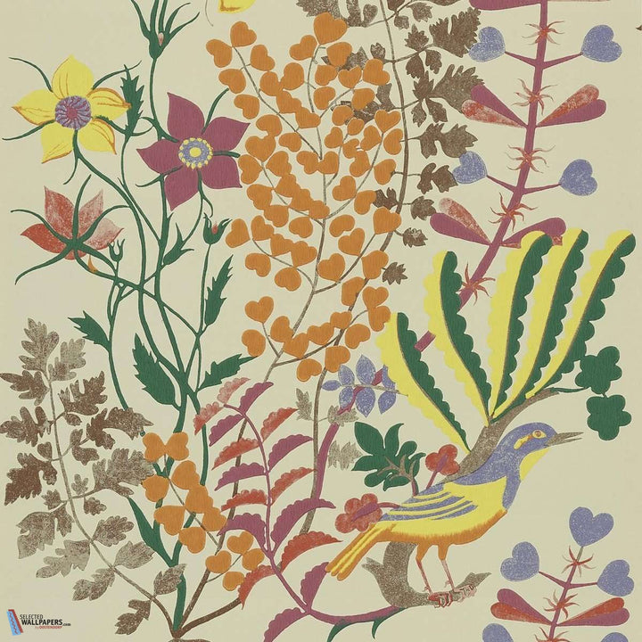 Coeurs de Marie Tapete von Pierre Frey. Eine Tapete, die den Frühling symbolisiert, voller Vögel und Schmetterlinge auf bunten Blumen und Farnen. Eine ländliche Komposition aus dem Archiv von Pierre Frey aus den 1940er Jahren.
