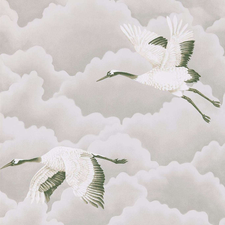 Cranes in Flight Tapete von Harlequin. Diese Tapete zeigt Kraniche während eines Fluges am Himmel. Elegante Kraniche schweben durch stilisierte Wolken.