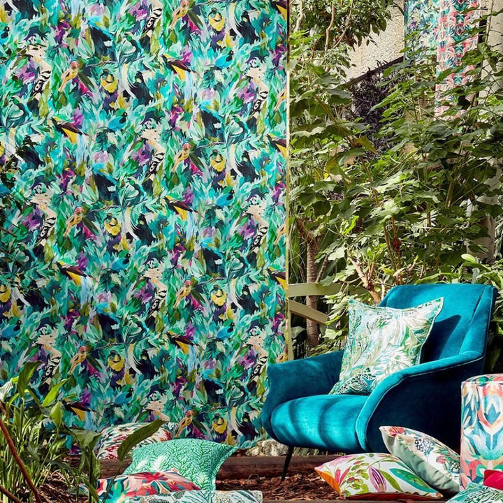 Dance of Adornment Tapete von Harlequin. Diese Tapete hat ein farbenfrohes Design voller tropischer Vögel. Der Tapete ist ebenso bunt und sorgt für ein Spektakel an der Wand.