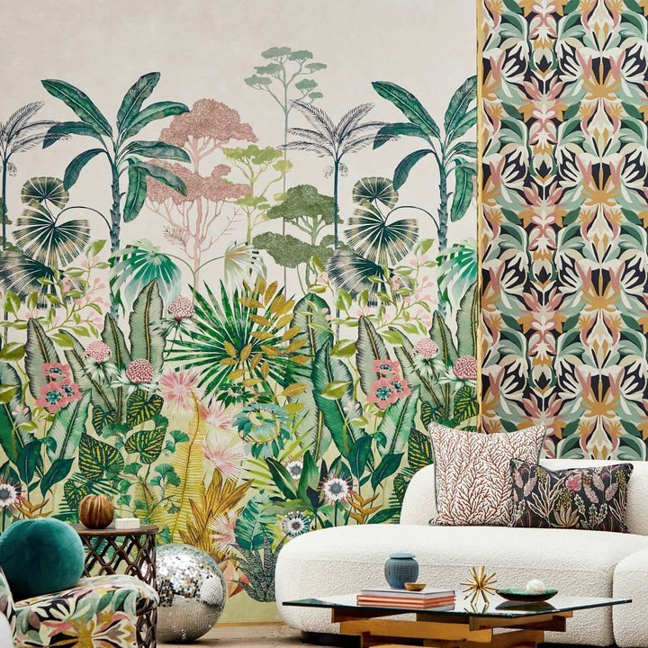 Floreana Tapete von Harlequin. Diese Tapete ist eine tropische Tapete voller Bäume und Pflanzen. In einer farbenfrohen und natürlichen Variante ausgeführt, eine wunderschöne stimmungsvolle Tapete.