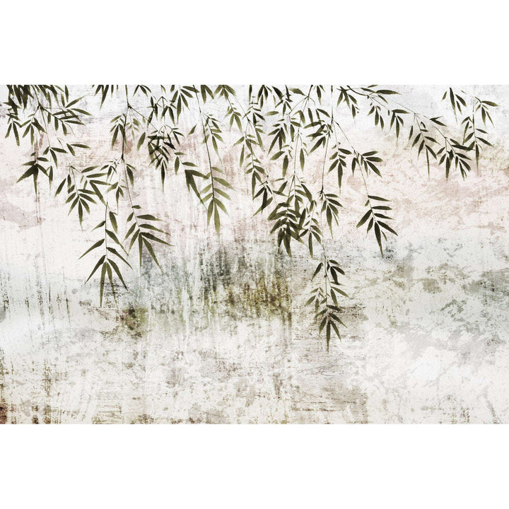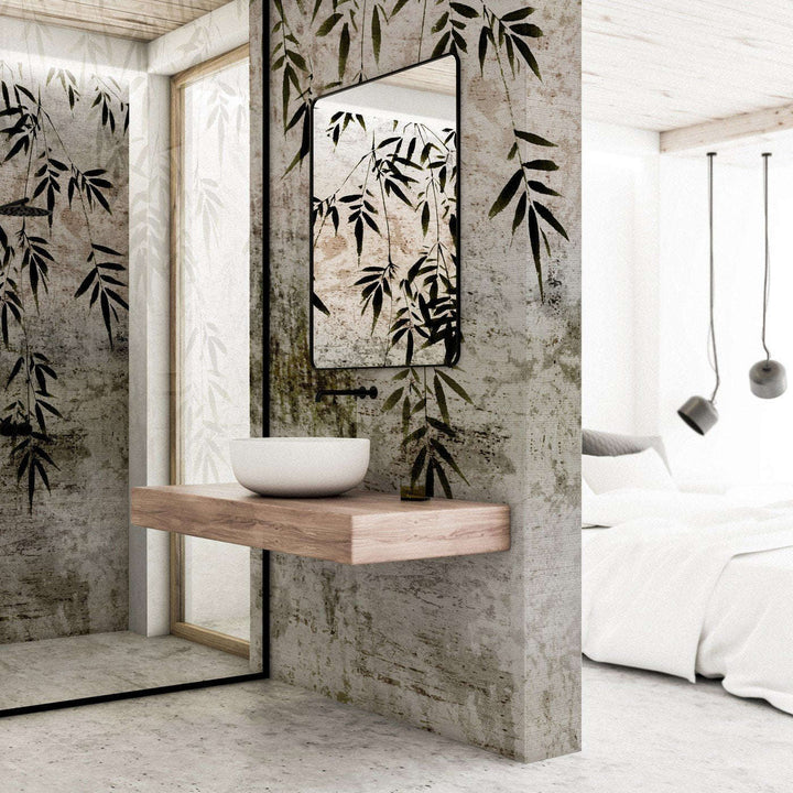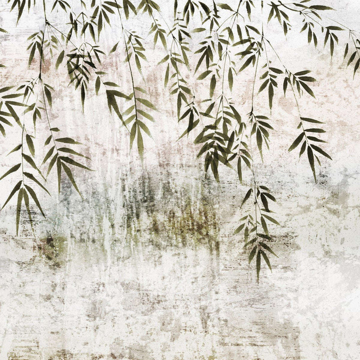 Fronde tapete von INSTABILELAB. Diese individuelle Tapete hat einen ruhigen orientalischen Look mit hängenden Bambusblättern. Eine angenehme und stimmungsvolle Tapete auf einem verwitterten Tapete.