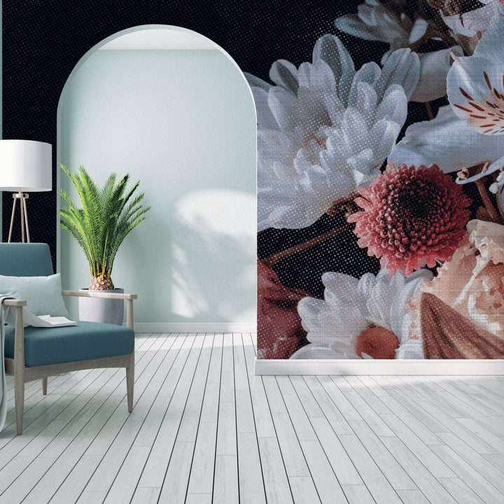 Immense Tapete von INSTABILELAB. Diese benutzerdefinierte Tapete zeigt riesige bunte Blumen auf einem schwarzen Tapete. Ein echter Hingucker in jedem Raum!