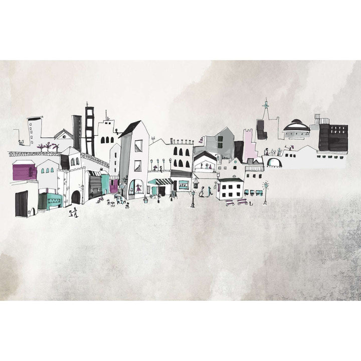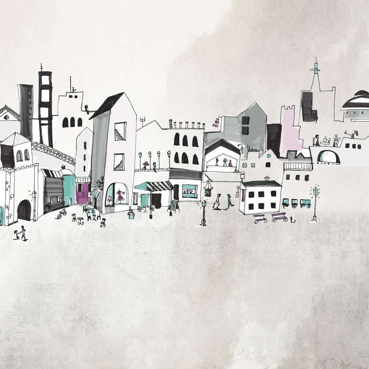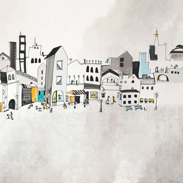 Invisable City tapete von INSTABILELAB. Diese benutzerdefinierte Tapete ist eine gezeichnete Stadt voller kleiner Überraschungen. Eine fantastische Tapete für ein Kinderzimmer.