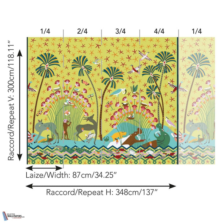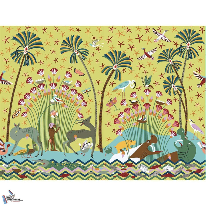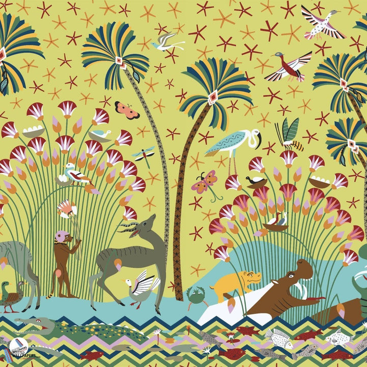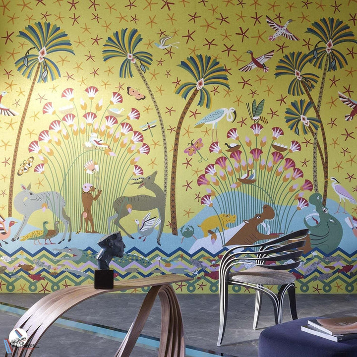 La Faune et La Flore Tapete von Pierre Frey. Diese Tapete illustriert eine zeitgenössische Landschaft am Ufer des Nils. Eine Hommage an Ägypten und auf Metallic Leinen gedruckt. Fröhliche und leuchtende Farben. Tapete La Faune et La Flore aus der Kollektion Merveilles D'Egypte von Pierre Frey.