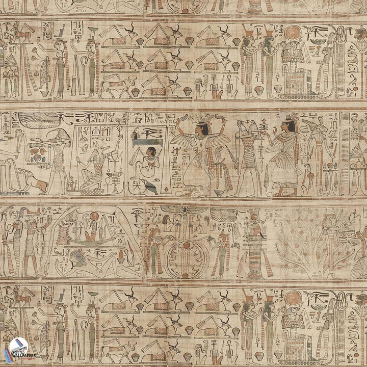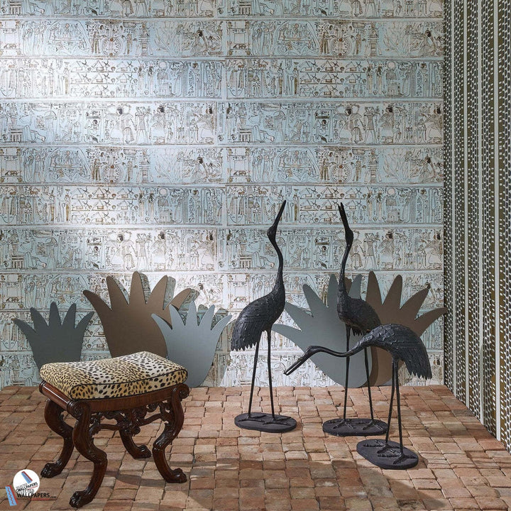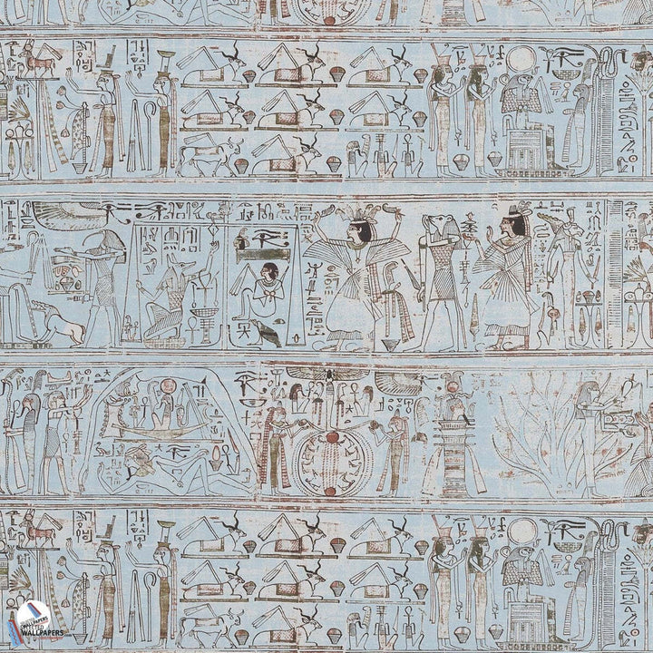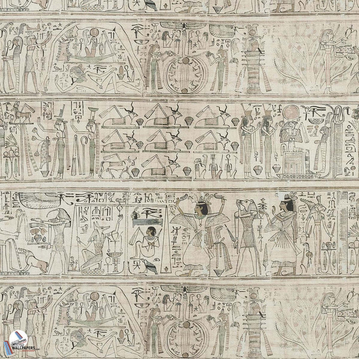 Le Scribe Tapete von Pierre Frey. Diese Tapete ist eine Komposition aus mythologischen ägyptischen Zeichnungen. Ein authentisches Design, das die ägyptische Schönheit zeigt. Tapete Le Scribe aus der Kollektion Merveilles D'Egypte von Pierre Frey.