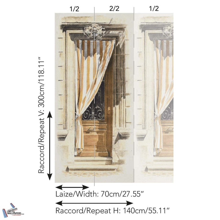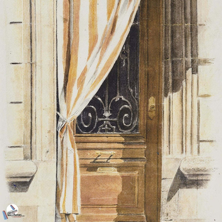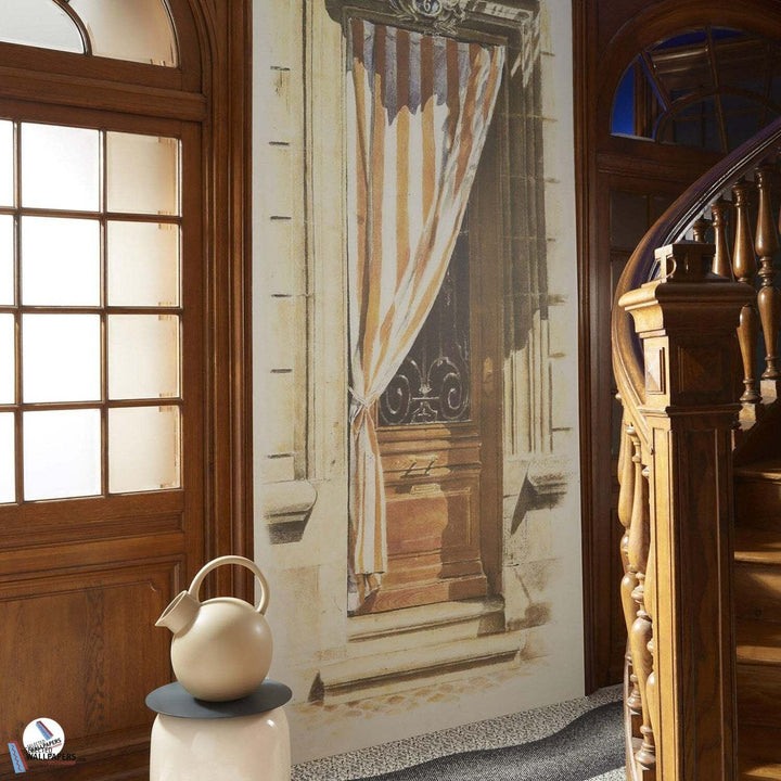 Les Portes de L'Ete Soleil Tapete von Pierre Frey. Diese Tapete ist ein Panorama, das Sie nach Bordeaux führt, wo sie ihre Türen mit Stoff bedecken, um die Lackierung zu schützen. Tapete Les Portes de L'Ete Soleil aus der Sammlung Gallerie 3 von Pierre Frey.