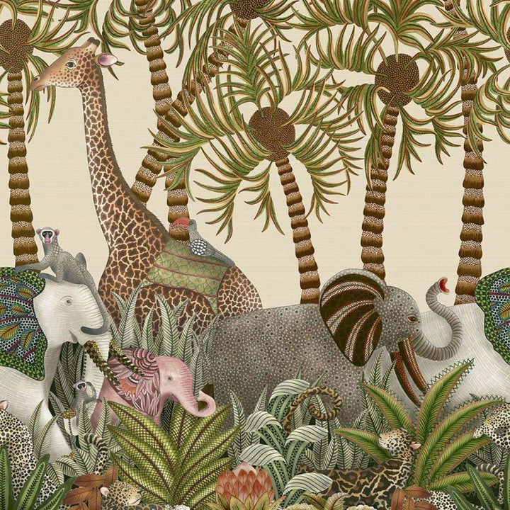 Letaba March Grasscloth Tapete von Cole and Son. Diese Tapete zeigt eine Parade von großen und kleinen Tieren auf dem Weg zu einer Wasserstelle. Verspielte Affen, Raubkatzen und Giraffen bilden zusammen mit den Elefanten einen Festzug. Eine lebendige und farbenfrohe tropische Tapete. Eine Tapete aus der Jabula Kollektion von Ardmore. Tapete Letaba March Grasscloth aus der Ardmore Jabula Kollektion von Cole & Son.