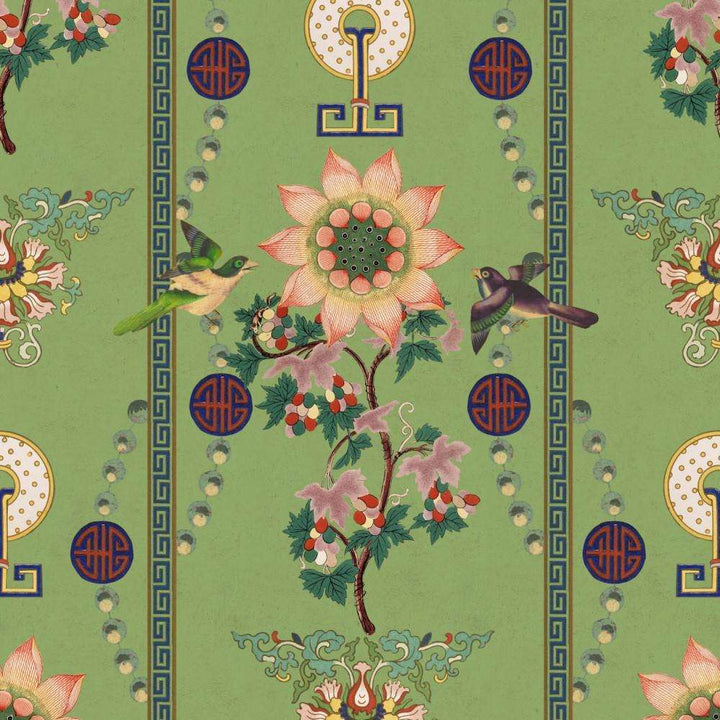 Lin Yuan Tapete von Mind the Gap. Diese Tapete hat ein strahlendes Blumenmuster, das von den berühmten chinesischen Gärten abgeleitet ist. Pflanzen, Vögel und Pflaumenblüten sorgen für eine authentische orientalische Atmosphäre.
