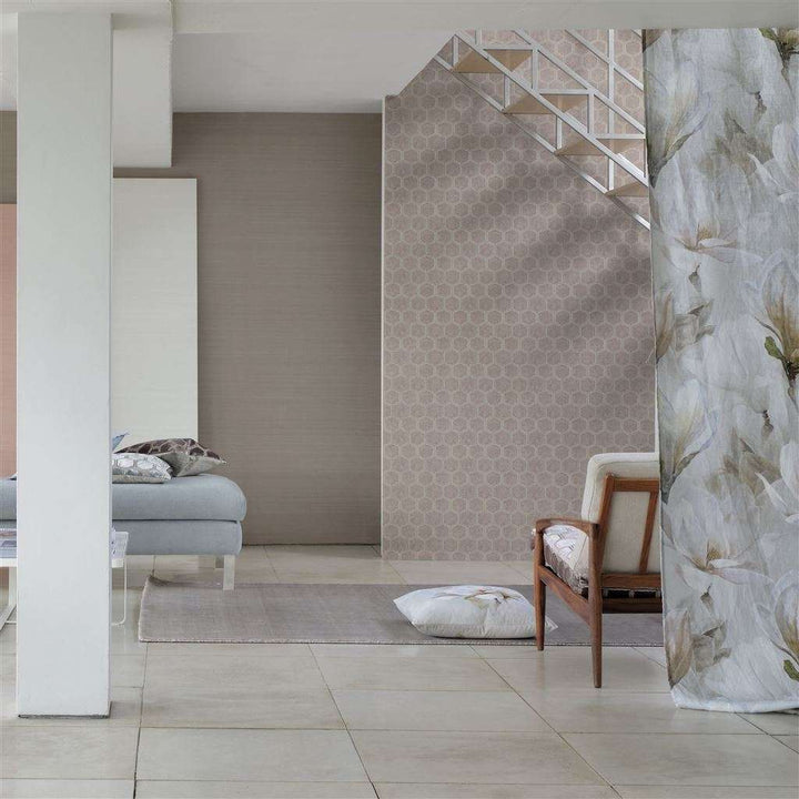 Manipur Tapete von Designers Guild. Diese Vinyltapete hat ein skaliertes geometrisches Design voller Sechsecke. Eine moderne Tapete mit matt strukturiertem Finish.