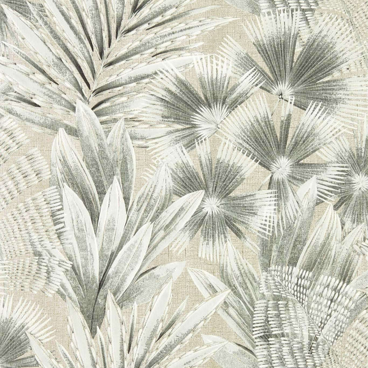 Matupi Tapete von Harlequin. Diese Tapete ist eine tropische Tapete voller Palmblätter. In Grau und Silber ausgeführt, eine Naturszene an der Wand.
