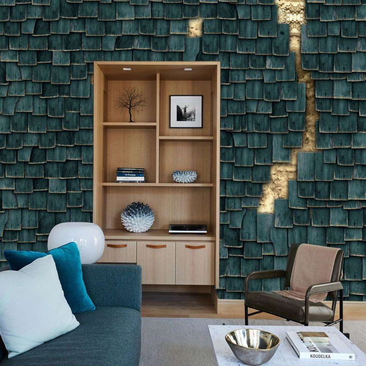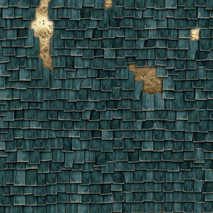 Murray Tapete von Muance. Diese individuelle Tapete ist voller überlappender Bretter und enthüllt goldene Details. Erhältlich in einer Serie von drei Farben, ein absoluter Stimmungsmacher in jedem Raum!
