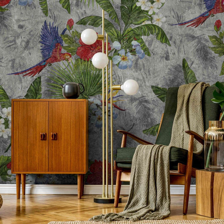 Parrot tapete von INSTABILELAB. Dieses benutzerdefinierte Tapete ist voll von farbenfrohen Seiten, die in ihrem natürlichen tropischen Lebensraum erscheinen. Eine farbenfrohe und präsente Tapete.