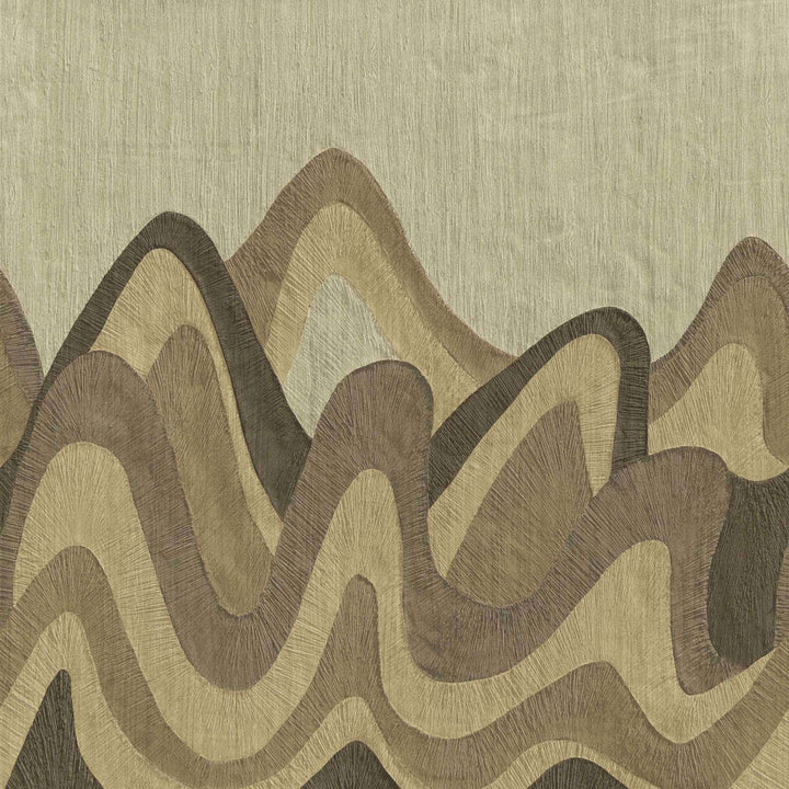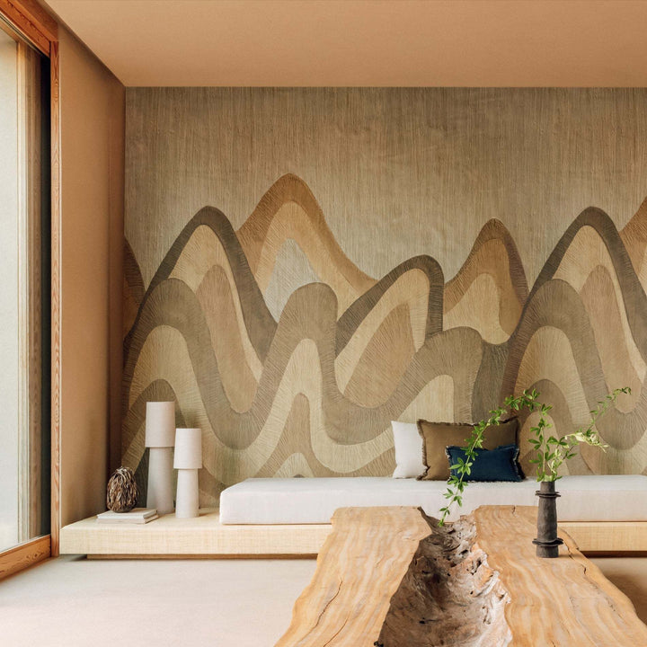 Pignada Tapete von Elitis. Diese Tapete hat die Optik und Haptik von Holz und wirkt ruhig, wie ein wogendes Meer oder eine Berglandschaft. Es schafft eine warme und natürliche Atmosphäre im Raum. Vinyltapete Silva von Elitis aus der Kollektion Bois Sculpte.