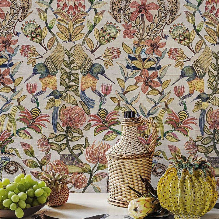 Protea Garden Seidentapete von Cole and Son. Diese Seidentapete ist ein wilder Wallach Print voller Blätter, Ranken und der Königsprotea Blume. Die Sunbirds Vögel erfreuen sich an den schönen Blumen. Eine Seidentapete aus der Jabula Kollektion von Ardmore. Tapete Protea Garden Silk aus der Ardmore Jabula Kollektion von Cole & Son.