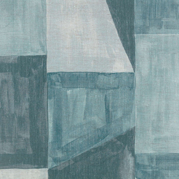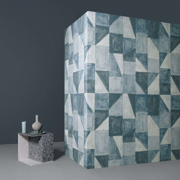 Reclaim Wall Mural Tapete von Kirkby Design. Diese Tapete ist ein geometrisches Wandbild, inspiriert von einem Denim Patchwork Stoff von Kirkby Design. Eine kühne Komposition aus Formen und Linien, die durch den handgemalten Effekt aufgeweicht werden. Gedruckt auf strukturiertem Leinen.