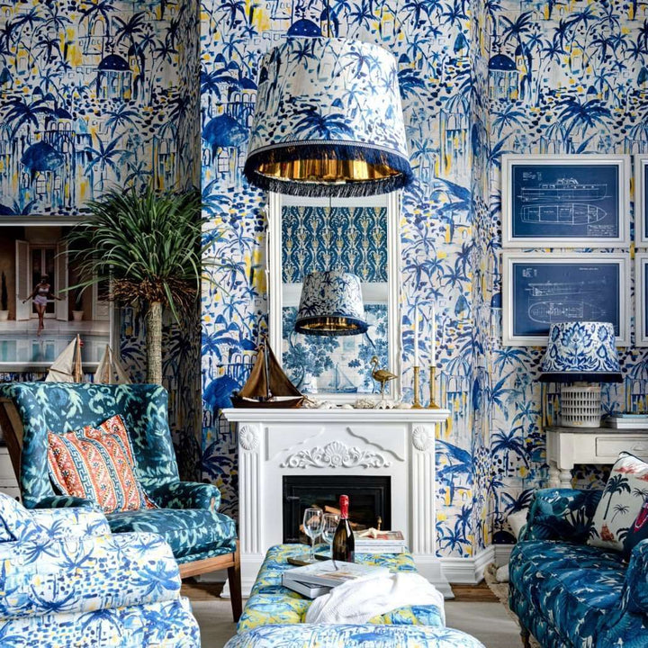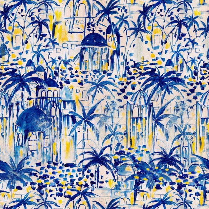 Rhodos Tapete von Mind the Gap. Diese Tapete ist wie ein Wandbild voller Architektur von der Insel Rhodos. Sommerliche Stimmung wird durch die Palmen und sandigen Details geschaffen.