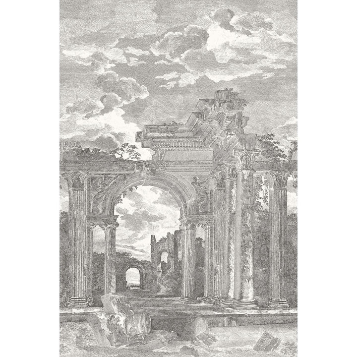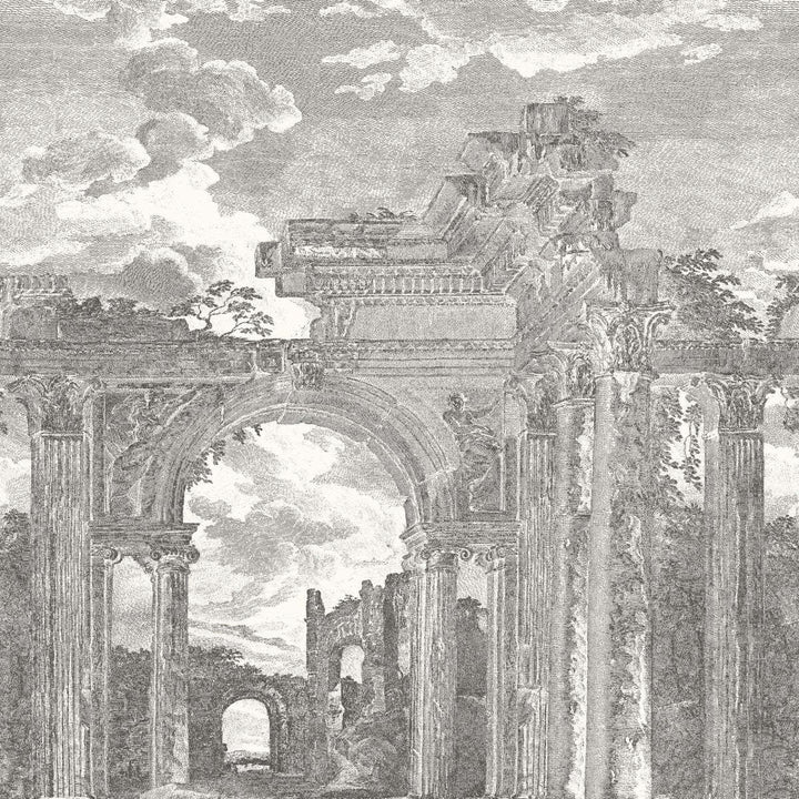 Rovine Tapete von Arte. Diese Vinyltapete ist ein stattliches Panorama, das einer Radierung einer griechischen Ruine nachempfunden ist. Das Design zeigt seine Antike im Verfall. Tapete Oblong aus der Rovine Kollektion von Arte.