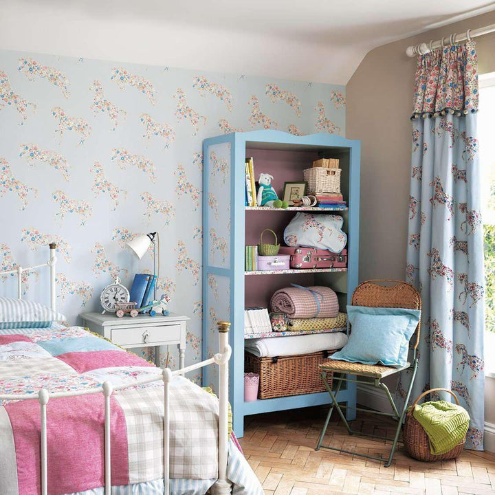 Pretty Poniess Kindertapete von Sanderson. Diese Tapete spricht seine Fantasie an. Tänzelnde Ponys in fröhlichen Farben.