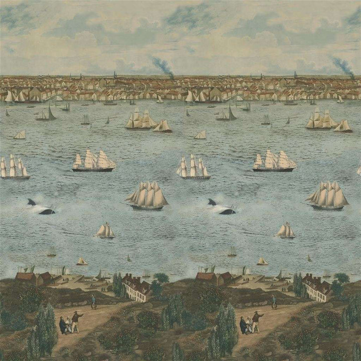 Seaport Ocean Tapete von Designers Guild. Diese Tapete ist eine klassische historische Szene eines Seehafens. Eine illustrative Panoramatapete voller Nostalgie.