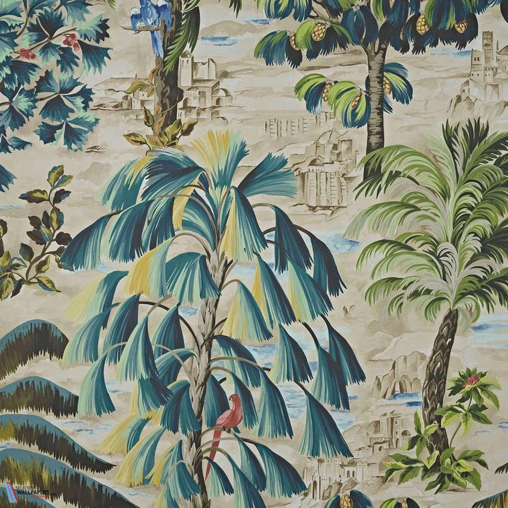 Tamanrasset Tapete von Pierre Frey. Eine Tapete mit einer üppigen Oase in der Wüste. Ein farbenfrohes und auffälliges Tapetendesign.