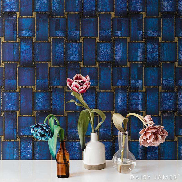 The Berlin Blue Tapete von Daisy James. Diese individuelle Tapete erzeugt Tiefe durch The überlappenden Oberflächen. Tiefe Blautöne mit goldenen Akzenten machen diese Tapete zu einem echten Hingucker. Maßgefertigte Tapete The Berlin Blue von Daisy James.