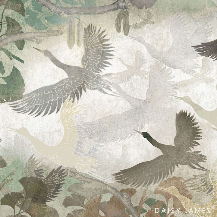 The Flock Tapete von Daisy James. These Tapete verleiht einen orientalischen Look, schöne Farben mit dem Kranich in der Hauptrolle. Benutzerdefinierte Daisy James Tapete, erhältlich auf Vinyl oder vollständig nahtlos auf Seamless Vinyl oder Pro Textile. Maßgefertigte Tapete The Flock von Daisy James.
