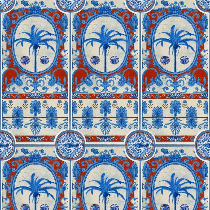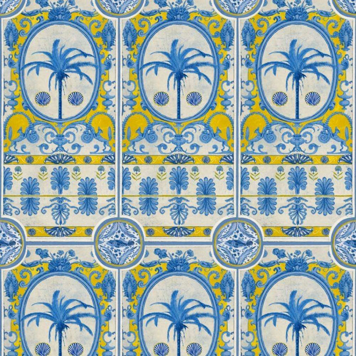 Die Villa tapete von Mind the Gap. Diese tapete hat ein Wandmalereidesign voller Ornamente und Motive auf Fliesen. Das Design erinnert an eine alte Palastmauer und ist in sonnigem Gelb oder tiefem Sonnenuntergangsrot erhältlich.