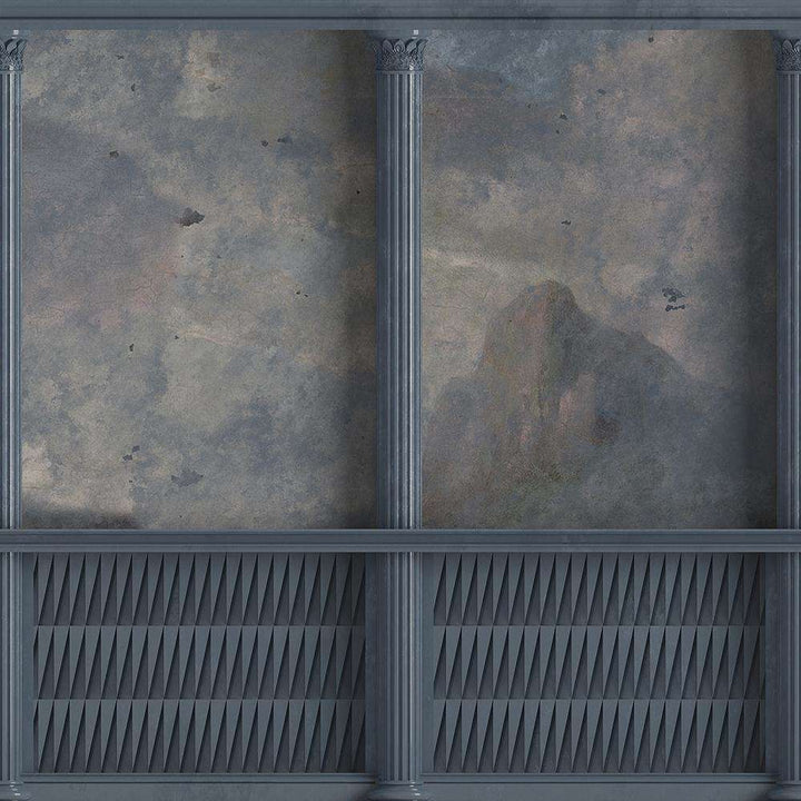 Therma Tapete von Inkiostro Bianco. Diese benutzerdefinierte Tapete kombiniert Architektur mit einer Landschaft aus Bergen und Wolken. Schaffen Sie mit dieser besonderen Tapete Tiefe in Ihrem Raum. Tapete aus der Architecture Kollektion.