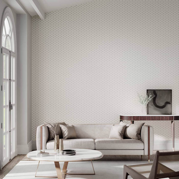 Trellis tapete von Harlequin. Diese Tapete hat ein geometrisches Design in dezenten neutralen Tönen kombiniert mit schimmernden Perlen.