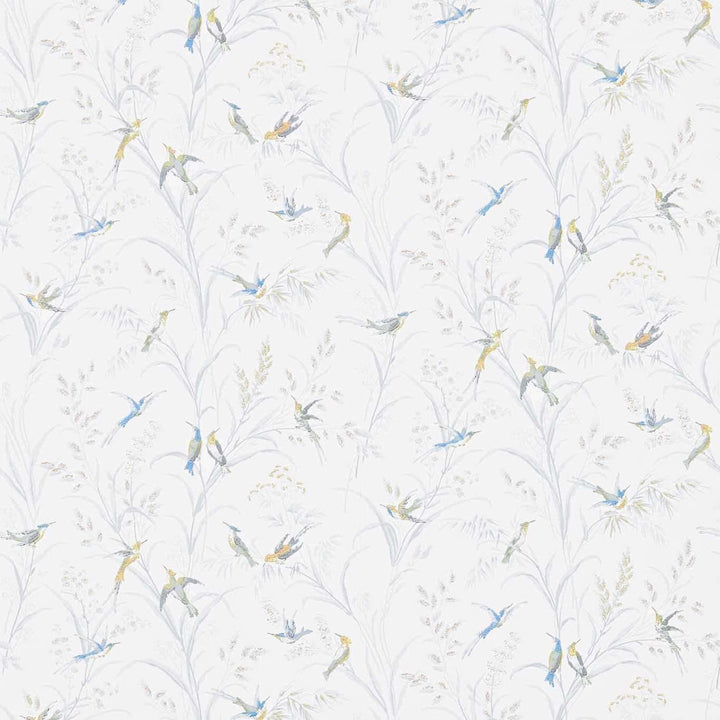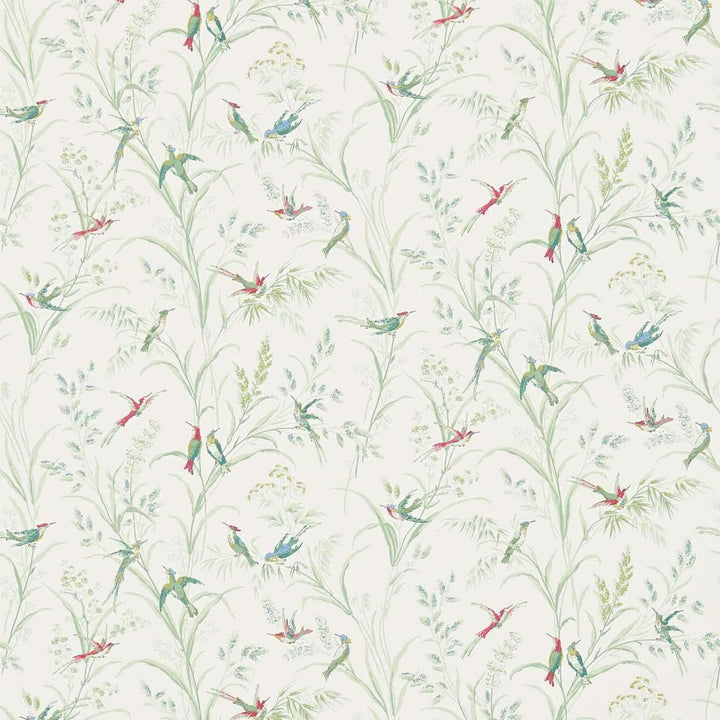Tuileries Tapete von Sanderson. Diese Tapete besticht durch ein elegantes Design mit wilden Gräsern, in denen bunte Kolibris leben. Aus dem Sanderson-Archiv und mehrschichtig gedruckt, um dem ursprünglichen Blockdruck-Design gerecht zu werden.