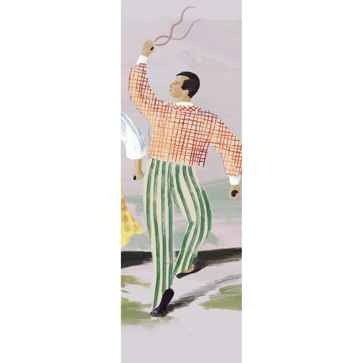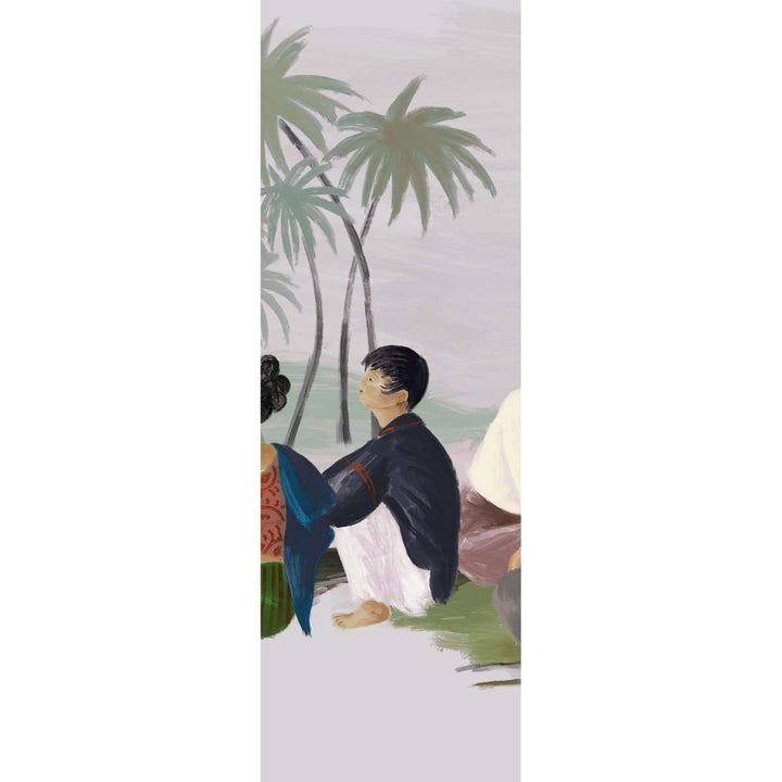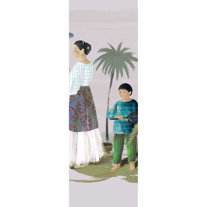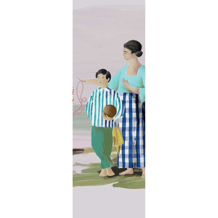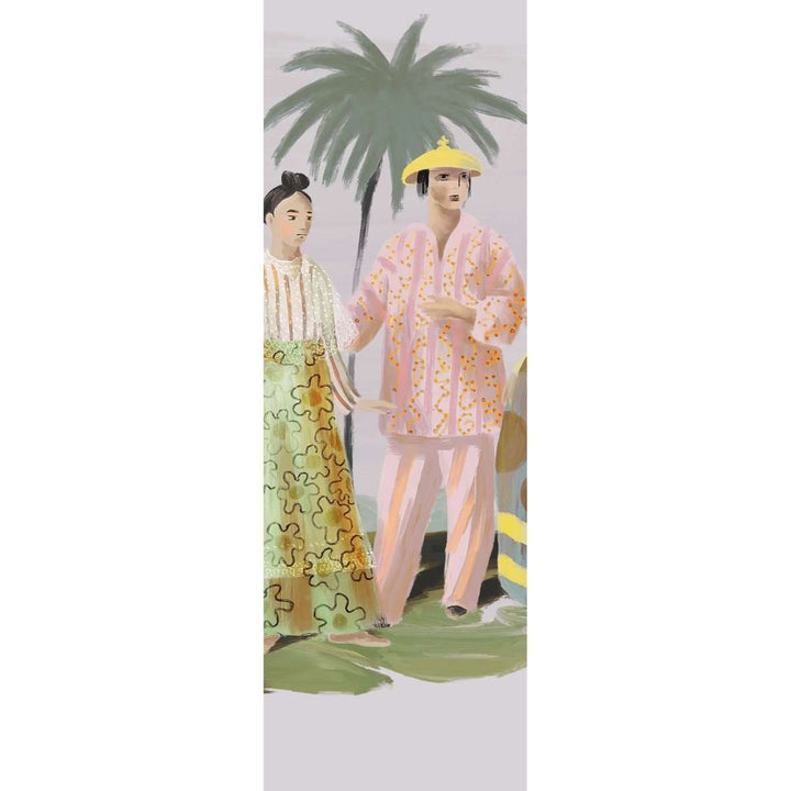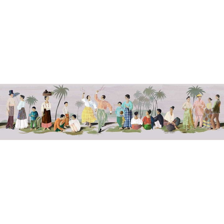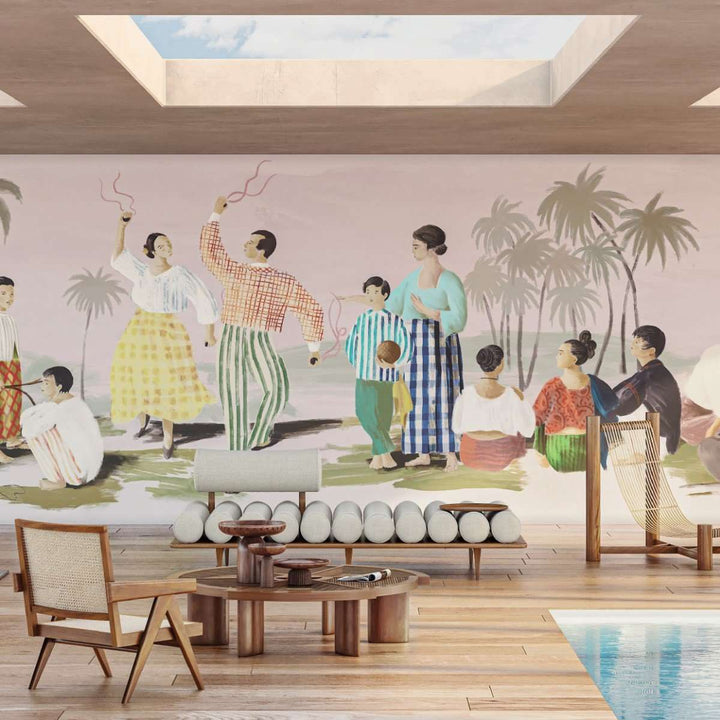 Panoramique Un Beau Dimanche von Elitis. Diese Panorama Tapete aus der 360 Kollektion ist ein Sommerpanorama voller farbenfroher Charaktere.
