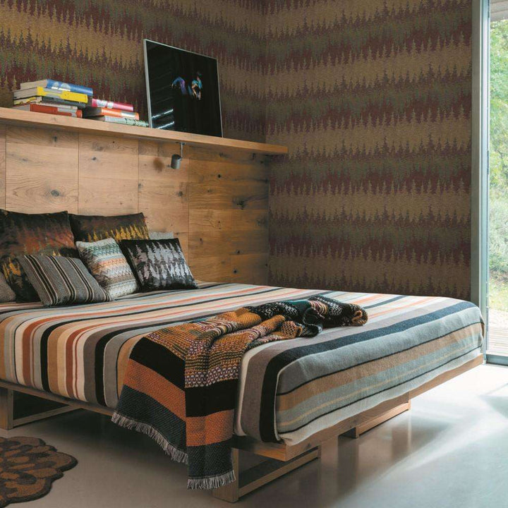 Alps tapete von Missoni Home by Arte. Diese Tapete schafft dank des sich wiederholenden Baummusters ein natürliches Waldgefühl. Durch den variierenden Farbeinsatz entsteht eine schöne Tiefe mit verbreiternder Wirkung.