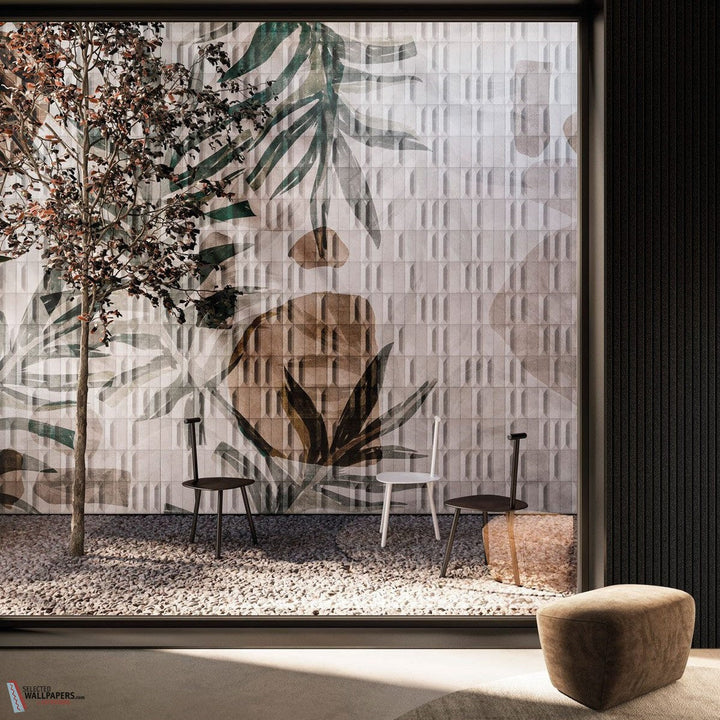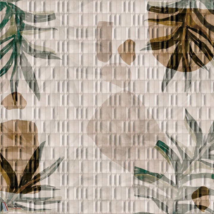 Yori-Tapete von INSTABILELAB. Diese maßgeschneiderte Tapete zeigt große Blätter und verleiht dem Raum eine exotische und entspannte Atmosphäre. Ein Design voller Konturen und Farbnuancen. Tapete Yori INSTABILELAB Avenue Tapetenkollektion.