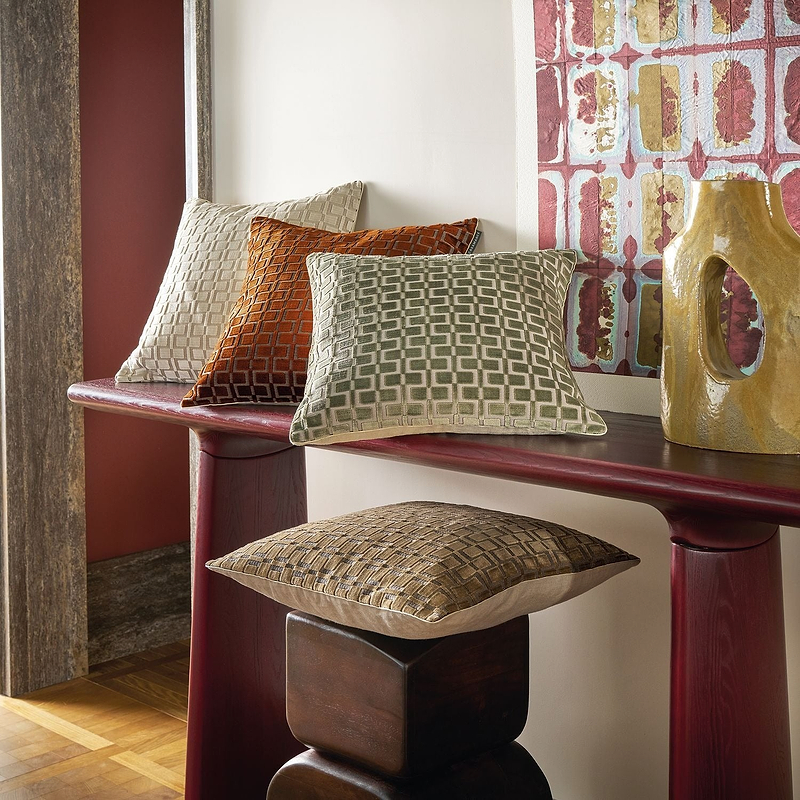 Casamance Analogy Cushion. This cushion is made with Analogy fabric and features a geometric pattern. The back is made of a solid-colored fabric.