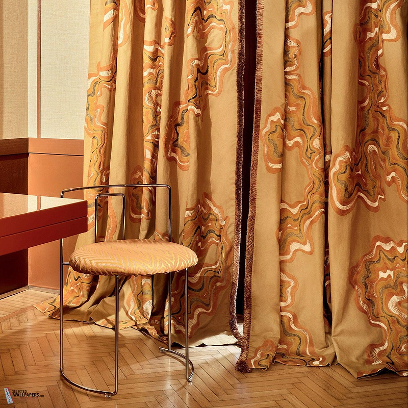 The Montballo fabric comprises a harmonious mix of gold, orange and sand tones, broken up with fine accent lines in dark brown and grey. These colours create a warm, inviting appearance that feels both vibrant and calming — perfect for adding a timeless, artistic accent to curtains or upholstery.