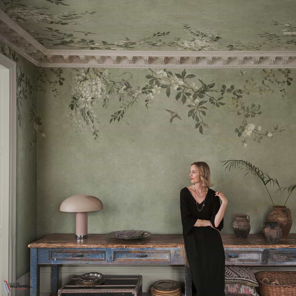 The Luca Square wallpaper displays a refined botanical composition that unfolds like a painting across the wall. Delicate floral vines with white blossoms and grey-green leaves form a graceful frame around a calm, mottled background in soft green and grey nuances. The watercolour-like execution with subtle colour transitions gives the whole a serene, nostalgic atmosphere reminiscent of old wall paintings in Italian villas.