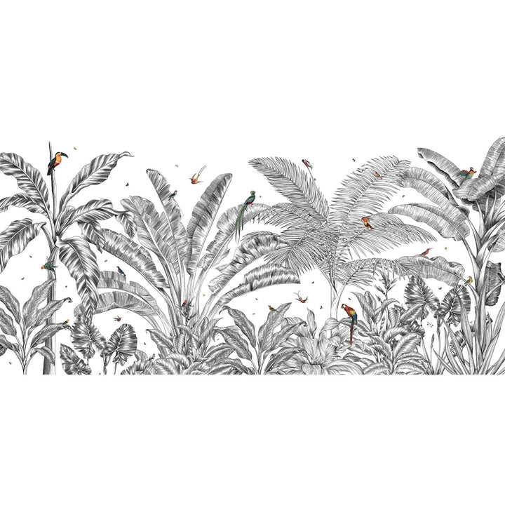 Fly Over wallpaper by Les Dominotiers. A panoramic wallpaper with exotic plants and leaves executed in black/white. Birds and butterflies provide a stunning colorful contrast. A toucan, parrots, and tropical birds add atmosphere to this striking wallpaper.