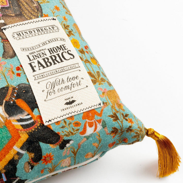 Hindustan Cushion Mind the Gap. A cushion made with the Hindustan fabric, a print with elephants. The back is made of the same fabric. Cushion Hindustan Mind the Gap .