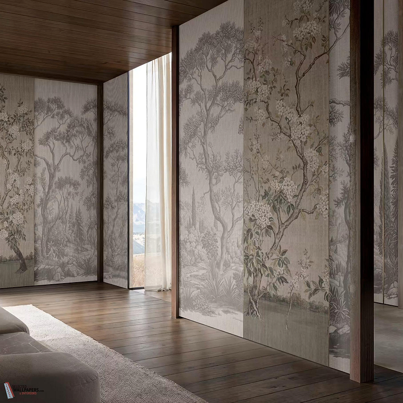 The Certosa wallpaper distinguishes itself by bringing together two different visual worlds: one panel radiates a graphic, almost ethereal forest atmosphere, whilst the other panel celebrates the vibrancy of blossoming branches. This duality makes the wallpaper particularly suitable for interiors seeking a balance between classical elegance and natural charm. The subtle colour transitions and layered compositions add a sense of timeless beauty to both contemporary and traditional spaces.