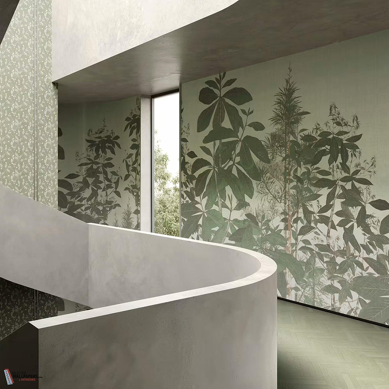 The Edelwald wallpaper is characterised by the rich overlapping of different plant species, from broad umbrella-shaped leaves to graceful ferns and subtle inflorescences. This botanical diversity creates visual depth and texture on the wall, perfect for interiors aspiring to a natural, organic atmosphere with an artistic twist. The design fits excellently in eclectic, botanical or modern classic living spaces where green accents are desired without excessive bright colours.