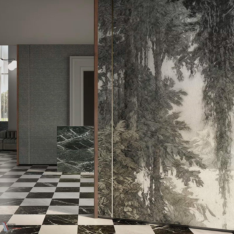 The Zarzuela wallpaper fits perfectly in interiors that long for a natural yet refined aesthetic. The graphic, almost sketched representation makes it suitable for both classic and contemporary spaces. The vertical lines of the tree trunks lead the eye upward and visually enlarge the space, while the soft colour palette ensures a serene, relaxed atmosphere without becoming intrusive.