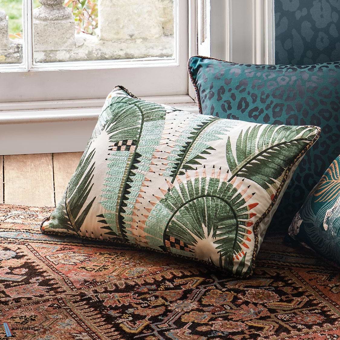Farrah Cushion Romo. A cushion made with the Farrah fabric. A cotton satin with a stylized palm leaves appearance with an Art Deco appearance. Cushion Farrah Temperley London X Romo collection.