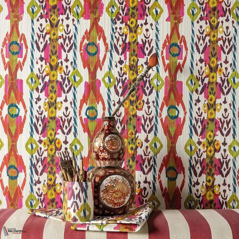 The Macao wallpaper brings the distinctive character of traditional ikat weaving to life in a contemporary colour palette. This design showcases the characteristic blurred contours and rhythmic motifs so typical of this artisanal technique. Coral red, fuchsia pink, mustard yellow and chartreuse green alternate against a neutral background, with accents of deep purple and petrol blue. The vibrant colour combination gives this Macao wallpaper a playful, worldly appeal that immediately catches the eye.