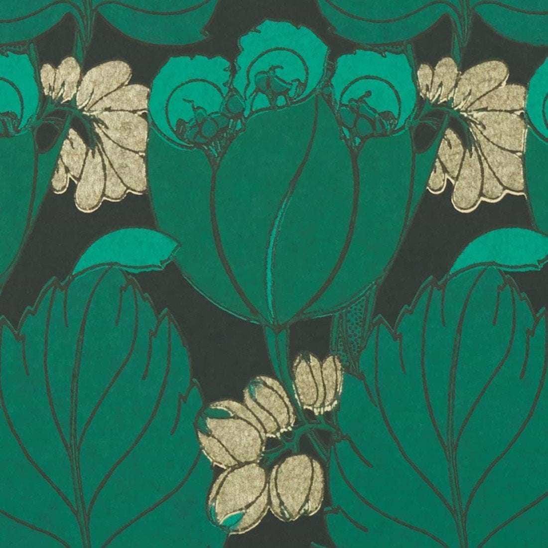 Regency Tulip wallpaper from Liberty. This wallpaper has a tulip motif in beautiful matte and metallic pigments. A classic in new modern colours. Art Nouveau collection Liberty.
